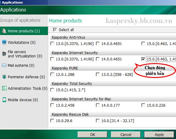 Chọn đúng phiên bản Kaspersky cần cập nhật Offline
