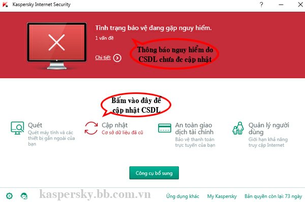 Thông thường, với máy tính có kết nối mạng Internet, phần mềm diệt virus Kaspersky sẽ tự động cập nhật CSDL mẫu virus mới hàng ngày hoặc bạn có thể bấm nút “Update” trong phần mềm để yêu cầu cập nhật